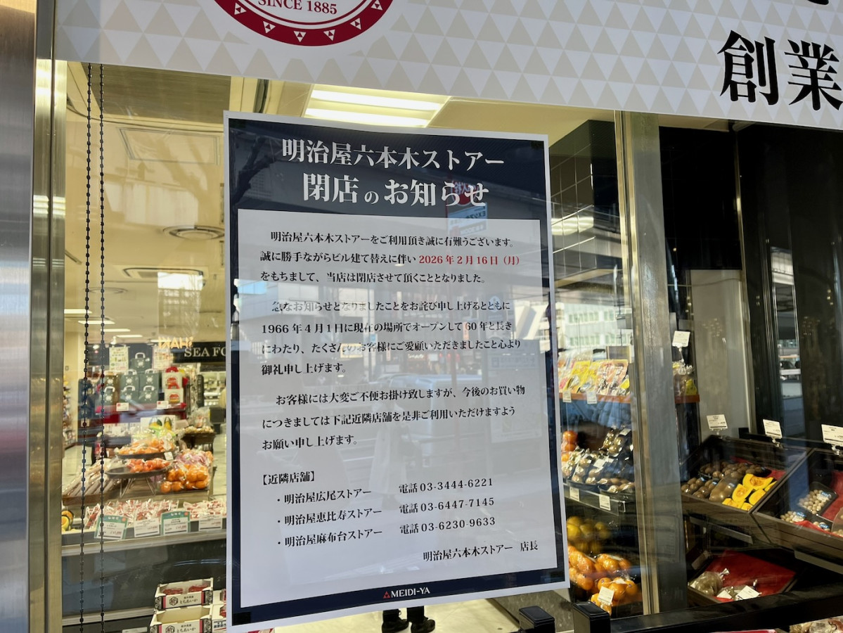 六本木のスーパーマーケット「明治屋六本木ストアー」(港区六本木7、TEL 03-3401-8511)が2月16日で閉店する。