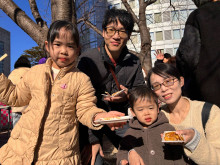 姉妹で参加した出穂(いずほ)ひろのちゃん(7)は「餅つき参加するのは2回目で、ようやく抽選に当たってうれしかった。家で食べるお汁粉とは違って硬い感じがしたが、甘くておいしかった」、弟のこう君(2)は「きねで餅をつくのが楽しかった。また来年も体験したい」と、それぞれ話していた。