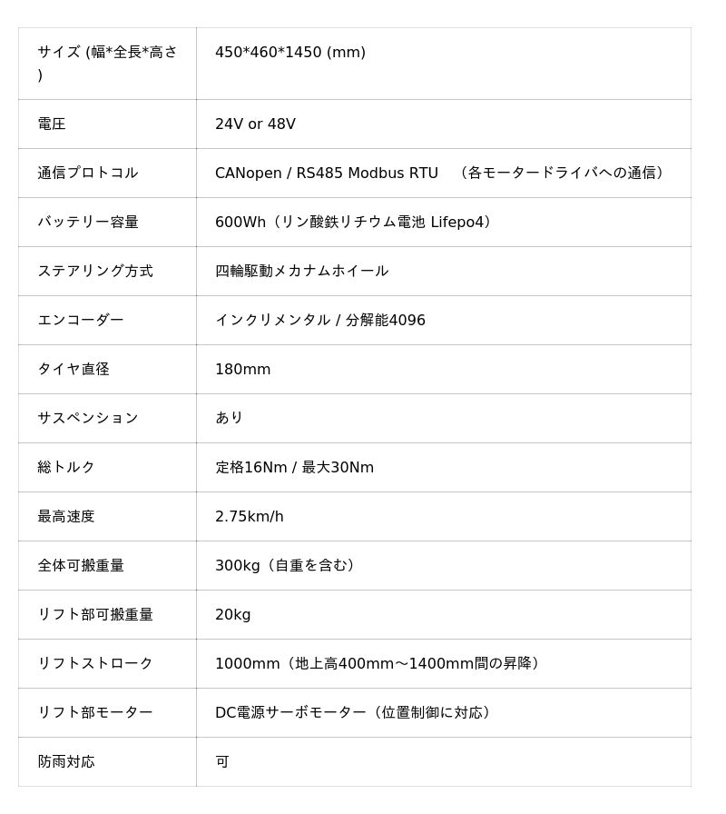 本サービスでは、最新のロボット開発シーンで求められる高積載量・高精度な姿勢制御・堅牢な通信インターフェースを標準で備え、研究機関や企業の高度な開発ニーズに柔軟に対応いたします。