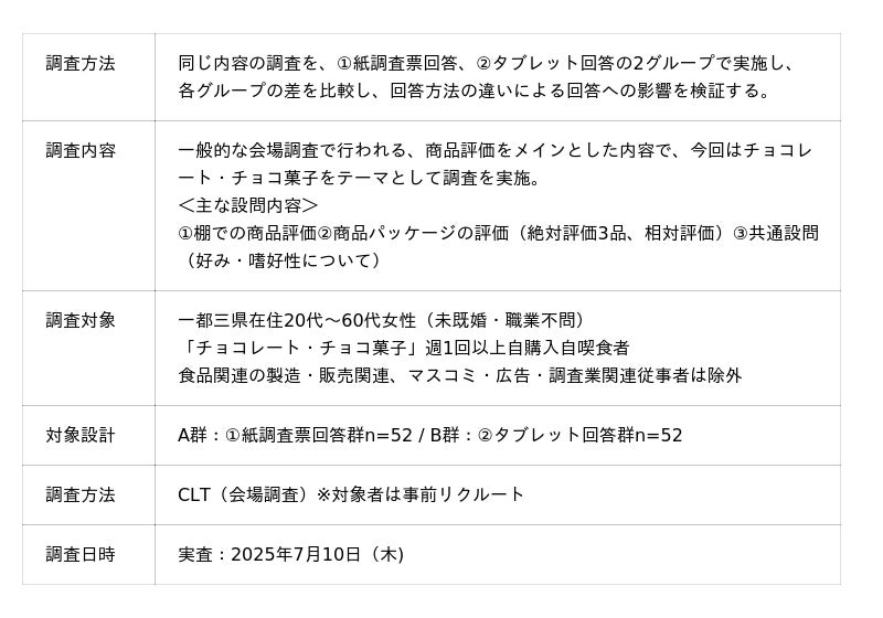 日本インフォメーション株式会社(本社:東京都中央区、代表取締役:斎藤啓太)は、アンケート調査において、紙回答とタブレット回答で回答傾向の差が生じるかを明らかにするために検証調査を実施しました。なお、今回はアンケート調査の中でも、生活者を会場に招集し、製品の試食や試飲、デザイン評価をおこなう「会場調査(CLT)」で検証しています。