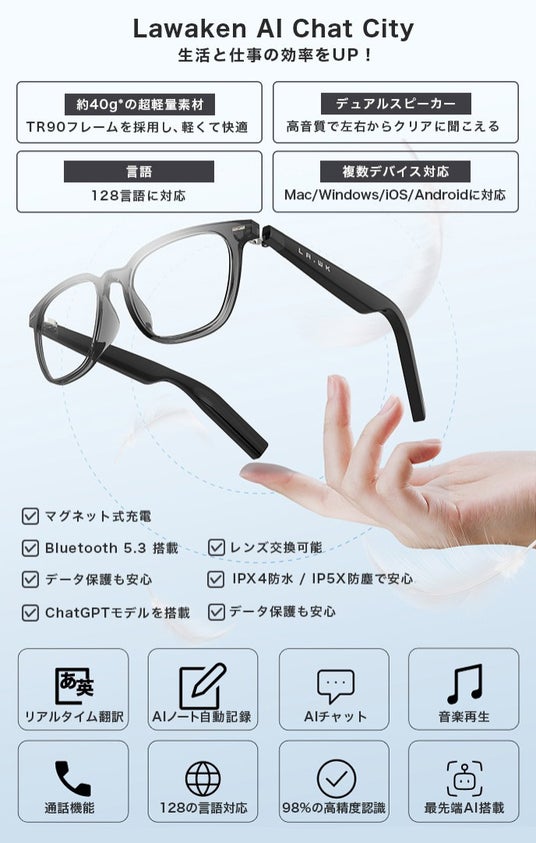 開発元であるLawaken Technologiesは、2021年の設立以降スマートアイウェアのパイオニアとしてAIとARを融合した開発に注力し、生活の質と効率を高めるインテリジェントグラスを追求してきました。「翻訳機・イヤホン・レコーダーをまとめ、会話を止めない」ことを目的に開発を進め、海外展示会で得たフィードバックを反映。独自AIモデルやChatGPT・Gemini・Claudeを最適化し、128言語翻訳や会議要約、AIアシスタント機能などを兼ね備え、尚且つ約40g*の軽量設計を実現しました。