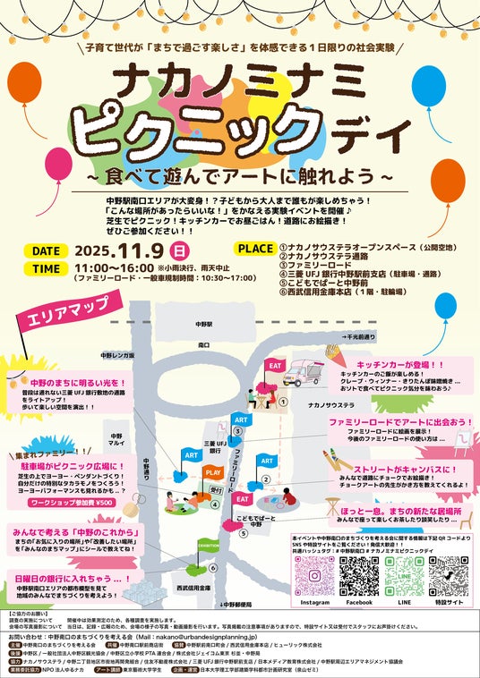 中野南口のまちづくりを考える会(会長:吉田稔夫)は、2025年11月9日(日)11:00~16:00 に、中野駅南口エリアにて「ナカノミナミ・ピクニックデイ~食べて・遊んで・アートに触れよう~」を開催します。本企画は、子どもから大人まで、エリアで子育て中のファミリー層が安心してくつろげる場所を提供すると同時に、道路空間やオープンスペースの新たな活用方法を探る「まちを楽しむ社会実験」です。当日は、人工芝のピクニックエリア、アート体験、キッチンカー休日の銀行で都市模型の展示などが登場し、中野駅南口の「未来の姿」を体感できる一日を創出します。