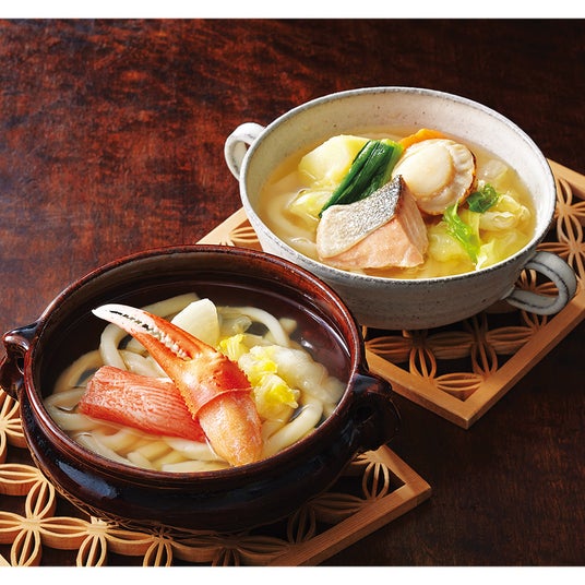 京料理の今に伝える<たん熊 北店>が監修。国産の紅ずわいがにの爪などを盛りつけた、あっさりとした「かにうどん」と味噌仕立ての「鮭うどん」をセットで。
