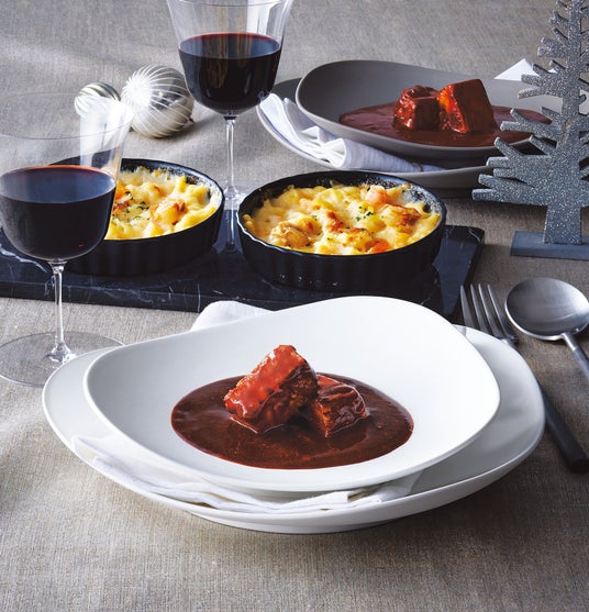大きめの牛肉がゴロッと入ったビーフシチューと、エビと帆立の旨みが楽しめるシーフードグラタン。心華やぐごちそうで、召しあがりやすい少量サイズです。