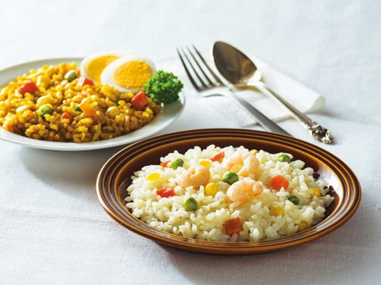 喫茶店の定番メニュー、バターが香る海老ピラフ、鶏肉がジューシーなチキンピラフ、風味が引き立つカレーピラフの3種をセットに。