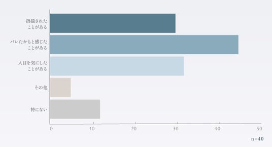 また、シリコンバッグ豊胸の見た目について、不安に感じた経験はありますか?という問いについても、「バレたかも、と感じたことがある」(45%)「実際に指摘されたことがある」(30%)など、人目を意識した経験を持つ人が少なくないことがわかりました。