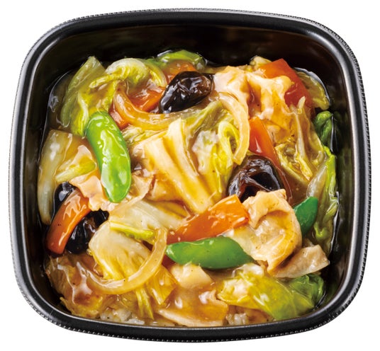 冬の大人気メニュー「中華あんかけシリーズ」は、醤油をベースにオイスターソースや紹興酒でコクを加え、仕上げにごま油で香り付けした中華餡が特長です。今年は新たに香ばしい炒め油を加えることで、より一層、風味豊かな味わいに仕上げました。豚肉や白菜、玉ねぎ、人参、きくらげなどの具材をたっぷり使用し、具沢山でごはんが進む満足感のある一品です。1日に必要な野菜量の1/2※1を摂ることができます。