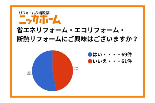 「省エネリフォーム・エコリフォーム・断熱リフォームにご興味はございますか?」という質問では、53.1%が「はい」と回答。