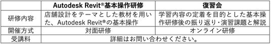 大型商業施設をはじめ、オフィス、ヘルスケア施設(クリニック等)、公共空間など、多彩な空間づくりを手掛けてきた現場最前線の知見を踏まえた独自の教材を利用し、Autodesk Revit(R)の基本操作を実務に近い形で効率的に学習できる内容にしています。またこれまで当社で教育してきた経験を生かし、スキルの定着を目的とした復習会も提供します。