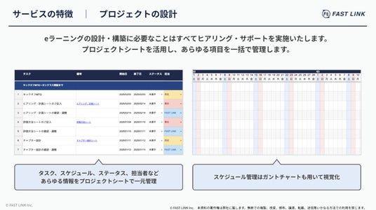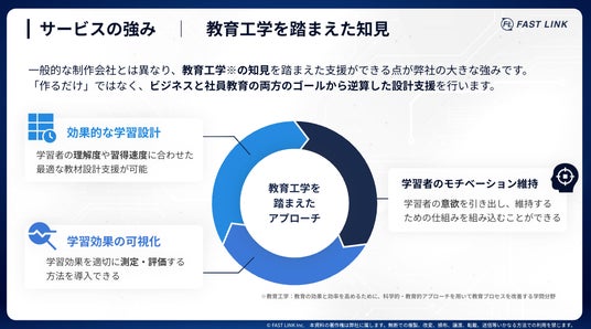 こうした課題に対し、株式会社FAST LINKでは、教育・学習設計から伴走するeラーニング内製化支援サービスの提供を開始しました。
